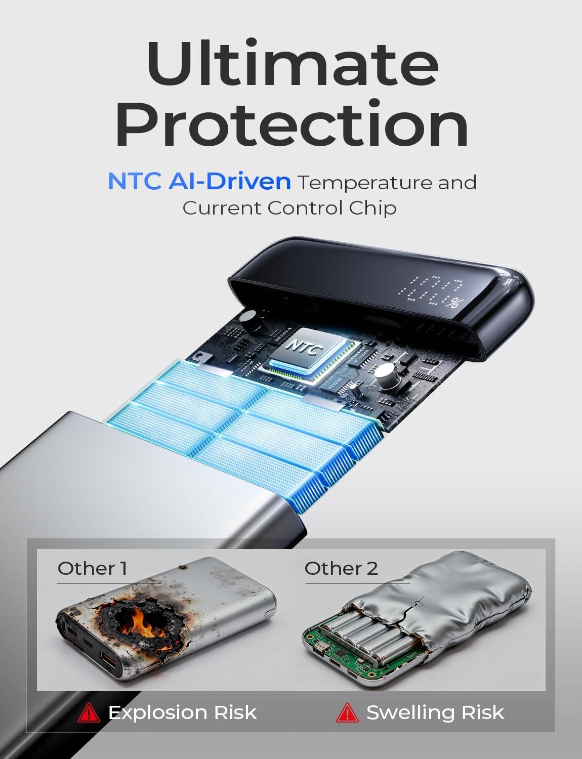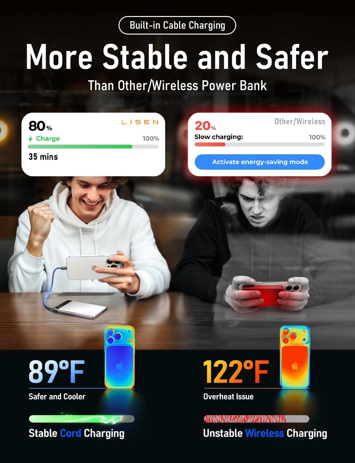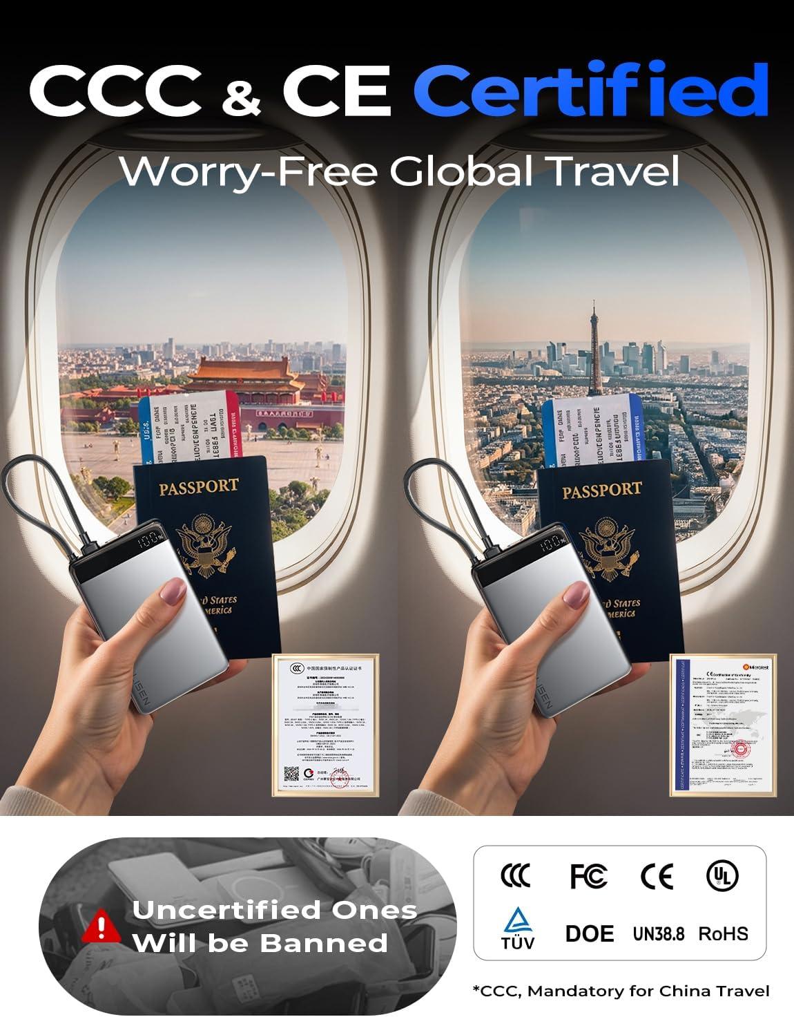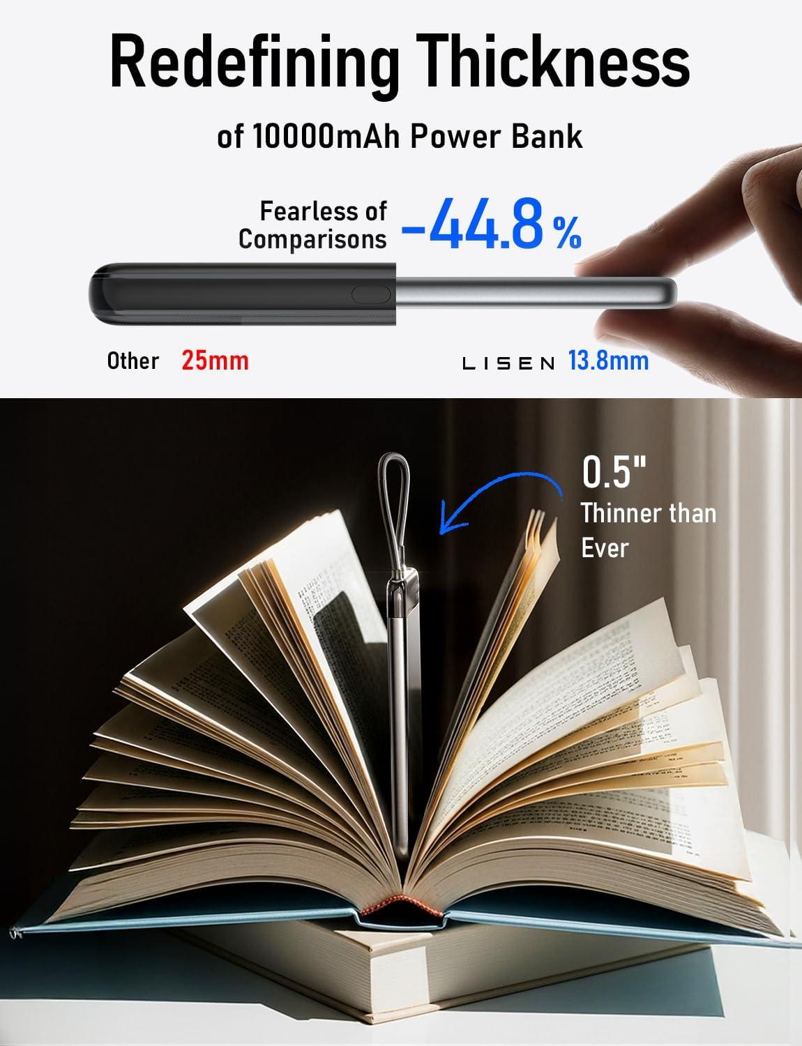 LISEN 0.5″ Ultra Slim Power Bank 10000mAh with Built in USB C Cable, Best Airplane Gadgets for Men Travel Essentials for Flying, CCC Certified Power Bank Small Mini Portable Charger iPhone 17 16 15(Silver)
