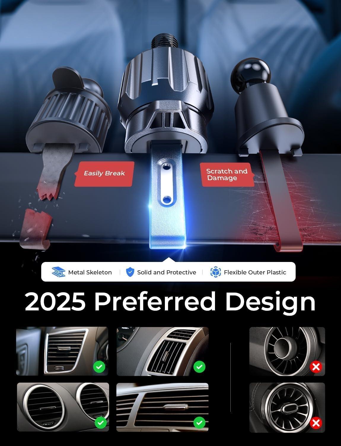 [Compatible with Horizontal & Vertical Vents]: The Steel hook clip of this cell phone mount for car is 50% longer than the ordinary one. It’s compatible with most Horizontal & Vertical vents, which solves the common problems of poor compatibility and cradle easy falling off on the market. 𝙉𝙤𝙩𝙚: 𝙍𝙤𝙪𝙣𝙙 𝙫𝙚𝙣𝙩𝙨 𝙢𝙖𝙮 𝙣𝙤𝙩 𝙛𝙞𝙩, 𝙖𝙣𝙙 𝙪𝙣𝙘𝙤𝙣𝙫𝙚𝙣𝙩𝙞𝙤𝙣𝙖𝙡𝙡𝙮 𝙨𝙝𝙖𝙥𝙚𝙙 𝙫𝙚𝙣𝙩𝙨 𝙢𝙖𝙮 𝙖𝙡𝙨𝙤 𝙗𝙚 𝙞𝙣𝙘𝙤𝙢𝙥𝙖𝙩𝙞𝙗𝙡𝙚