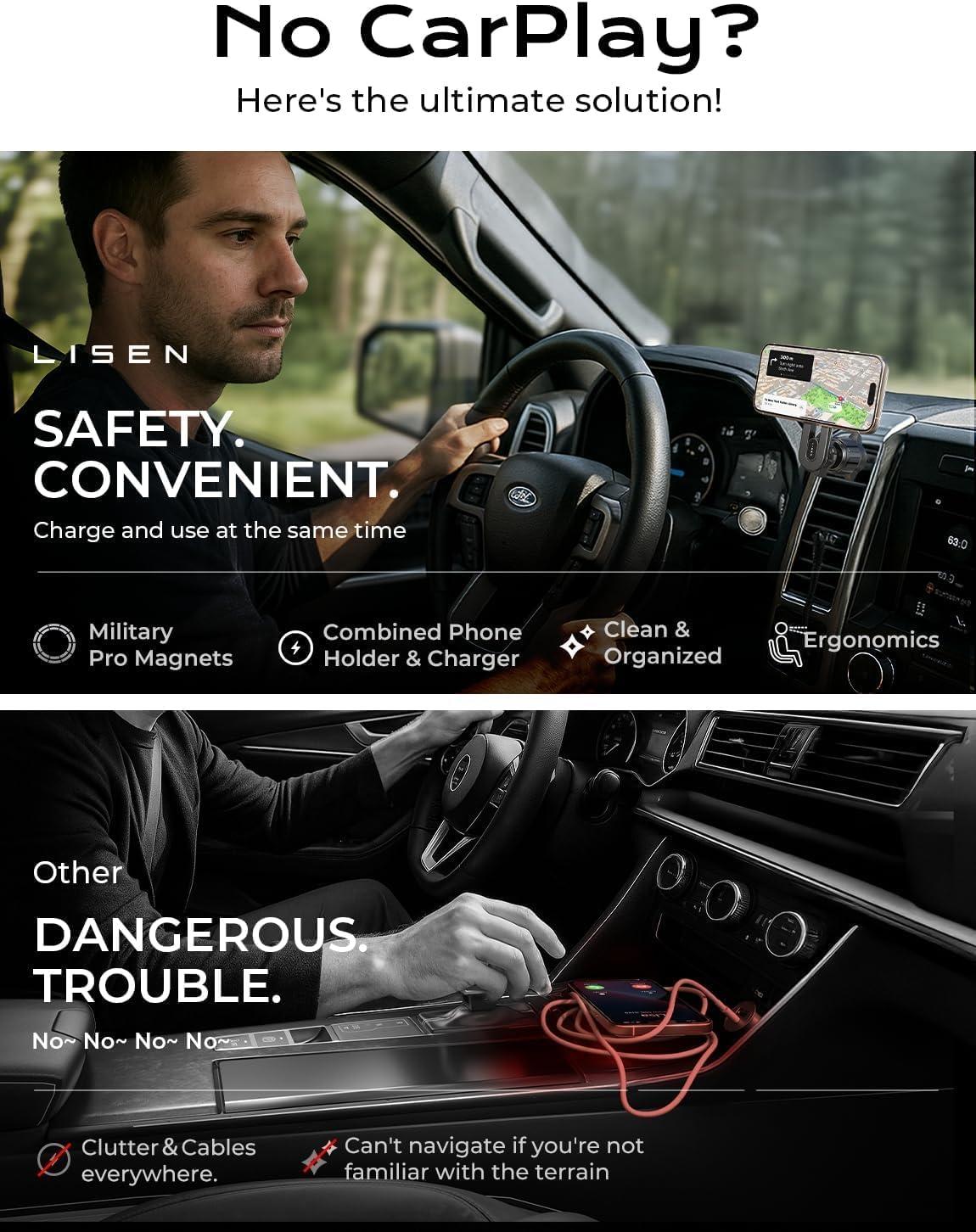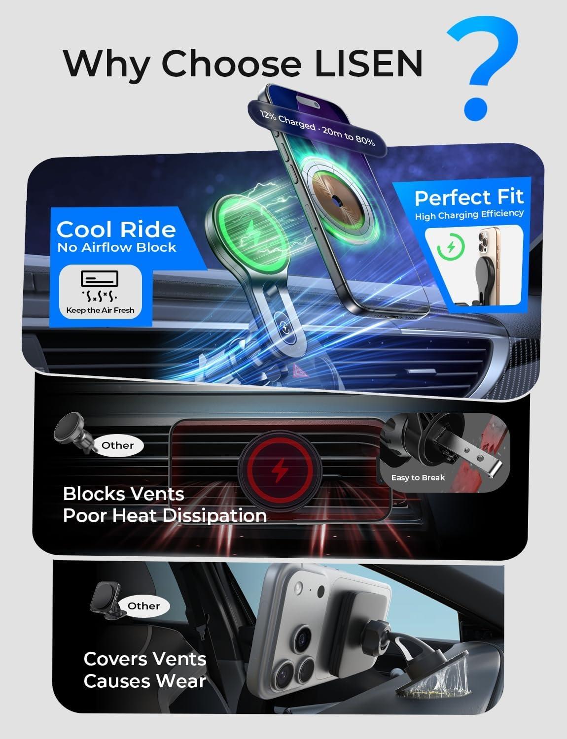 [One-Click Release]: Enjoy the convenience of one-click operation for easy phone placement and removal. No need to fret over complex installation steps, keeping you focused on your driving, LISEN magsafe car mount fast charging Suitable for iPhone 17 16 15 14 13 12 series and other phones supporting Wireless charging. We provide a one-stop solution to satisfy all your charging needs