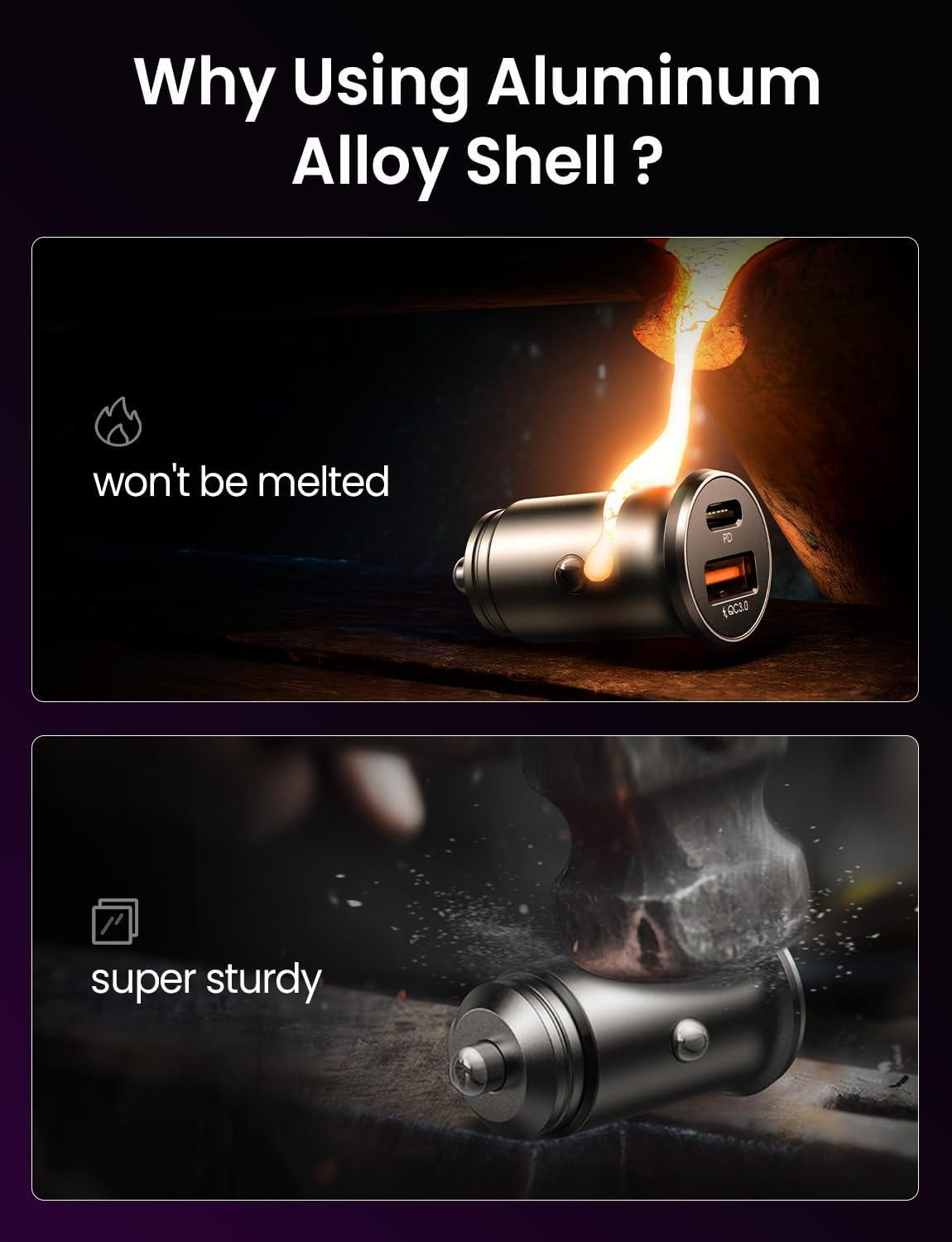 ๐น ALL-ALUMINUM SHELL, WONโT MELT: Built with a solid aluminum alloy body, this 12V car charger USB C ensures 15% better heat dissipation than plastic chargers โ no melting, no overheating, and no burning smell. The sleek metallic finish elevates your car interior while providing unmatched durability. Ideal for car, truck, SUV, and RV use.